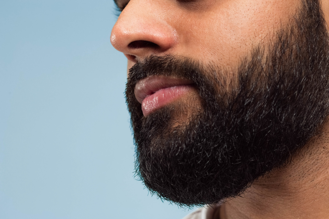 Close up portrait of young hindoo man’s face with beard and lips on blue background. Looking calm. Human emotions, facial expression, advertising concept. Negative space.